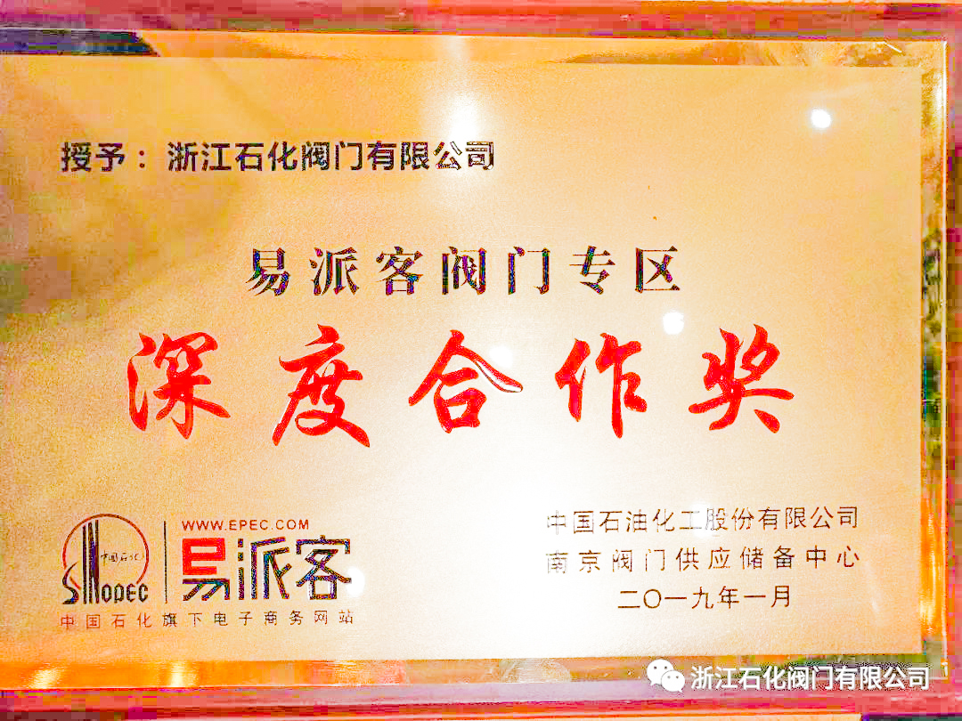 浙江石化閥門有限公司榮獲“2018年度中國石化優秀閥門供應商”、“易派客閥門專區深度合作獎”的兩項榮譽。